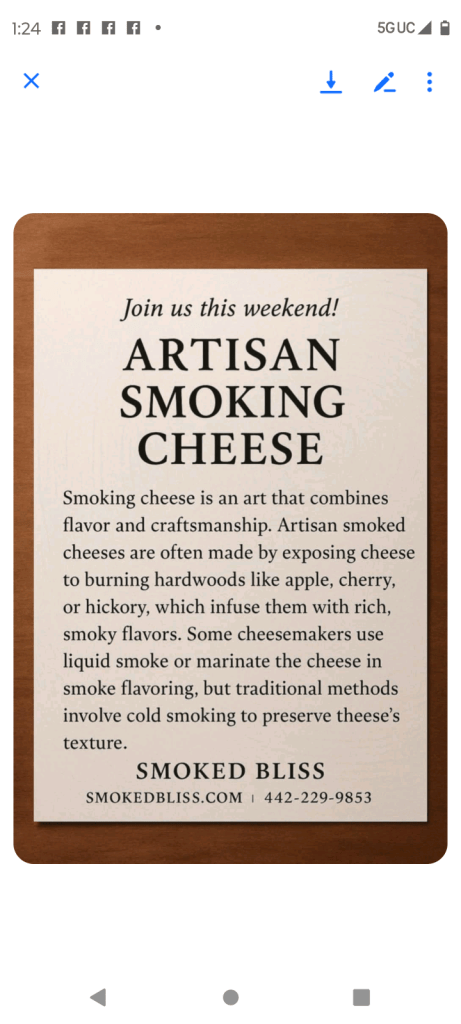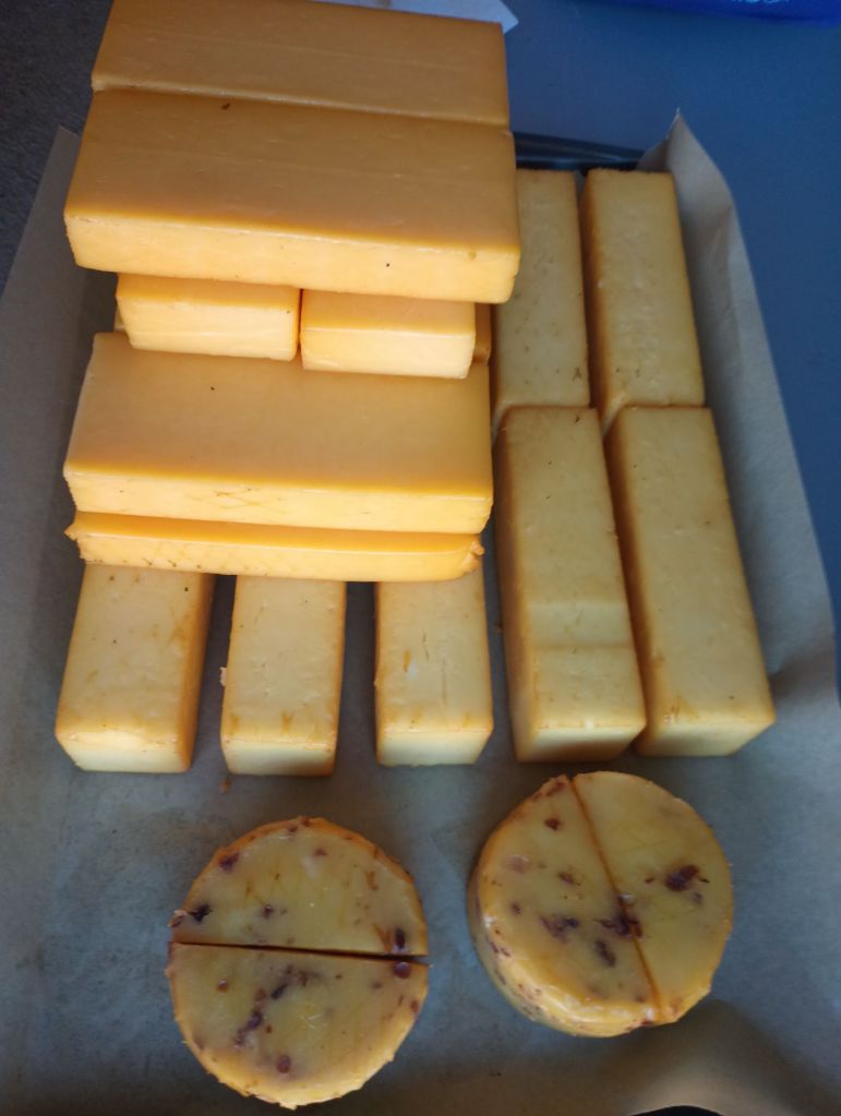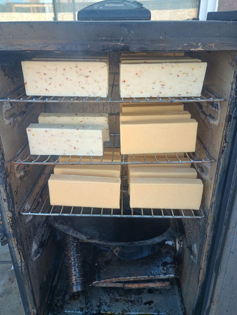 Another new batch. Look me up. Pepper jack,Gouda, my favorite, cranberry white cheddar. Superbly smoked for 4hrs with apple, cherry mix.
